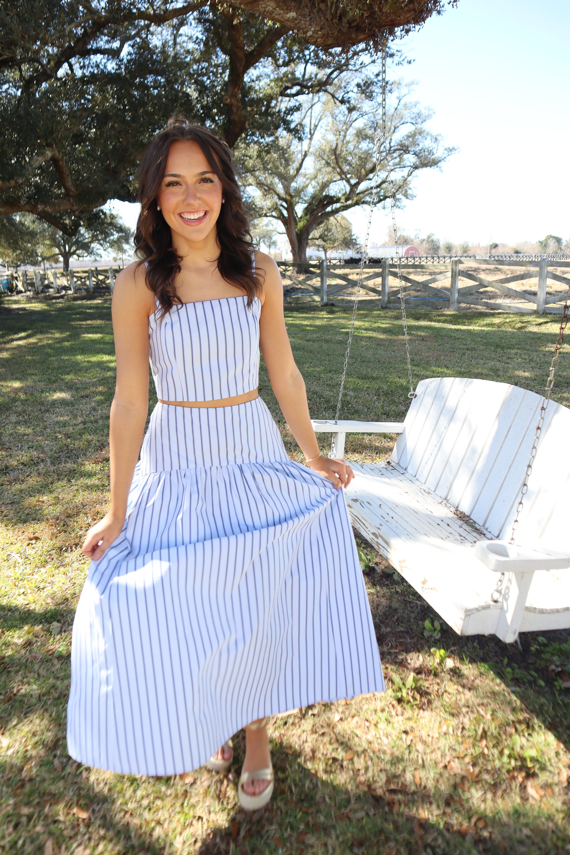 The Dallas Striped Set brings effortless style to your spring wardrobe with its crisp light blue and navy stripe pattern. This versatile piece transitions seamlessly from casual days to weekend outings, offering a fresh, timeless look that works year-round. The classic stripe combination flatters every complexion while keeping you feeling confident and put-together. Perfect for layering or wearing solo, this set captures the essence of spring sophistication with a modern edge.