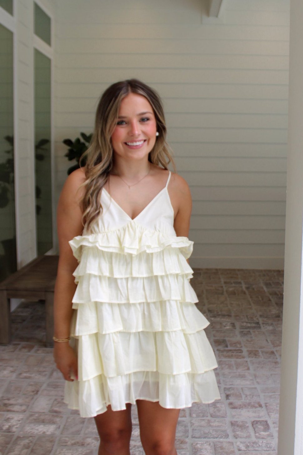 The Francesca Dress is the perfect choice for gameday with its soft, pale yellow hue and girly tiered ruffle design. Its cute and playful style will have you looking and feeling confident as you cheer on your team. Elevate your game day outfit with this must-have dress.