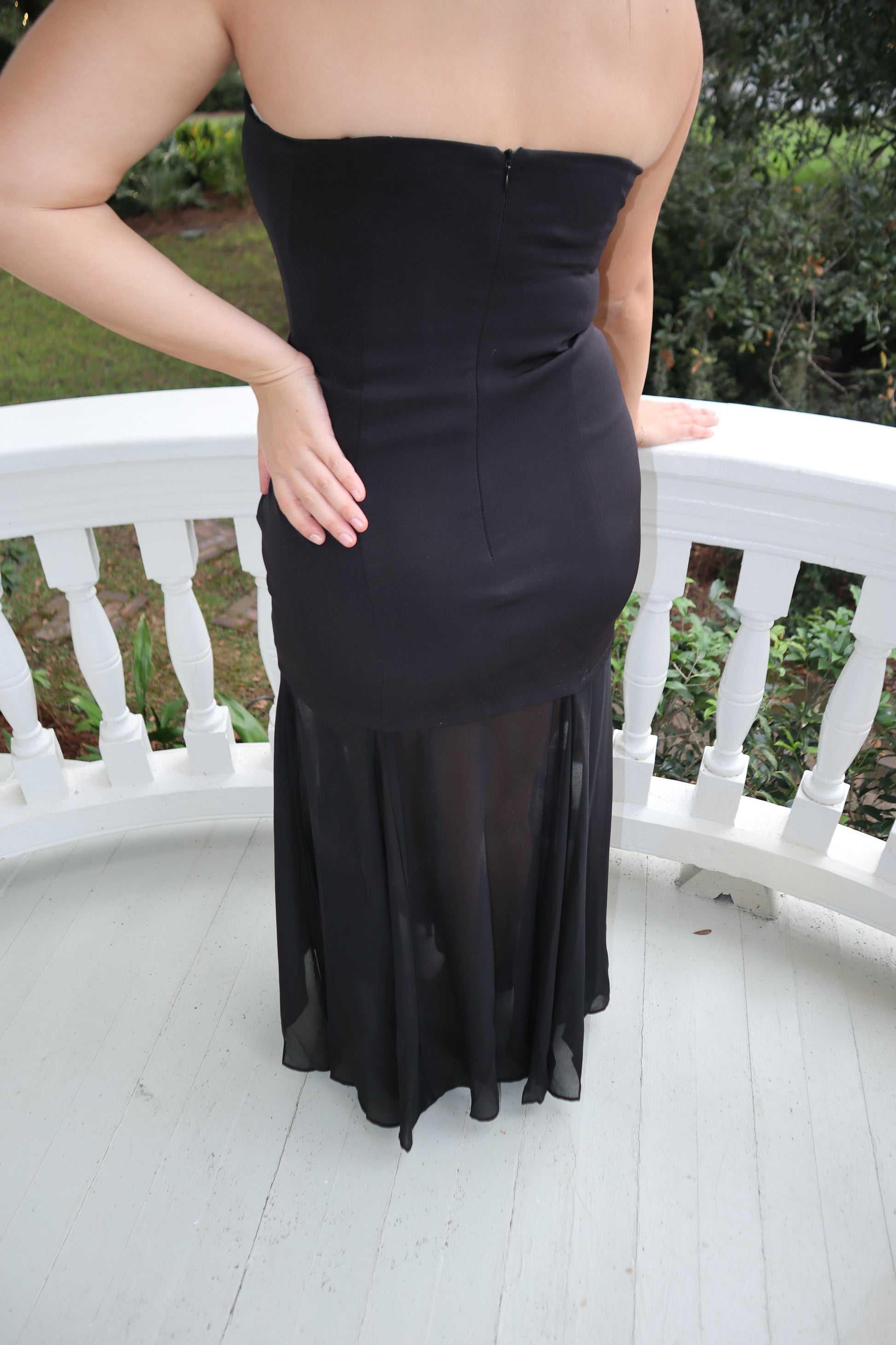 The Marlo Maxi Dress in black combines elegance with a modern edge. Its strapless design highlights your shoulders gracefully, while the sheer bottom adds a touch of alluring sophistication. A hidden zipper ensures a seamless fit, keeping the silhouette sleek and flattering. Perfect for evening events or special occasions, this dress effortlessly elevates your style with timeless charm.