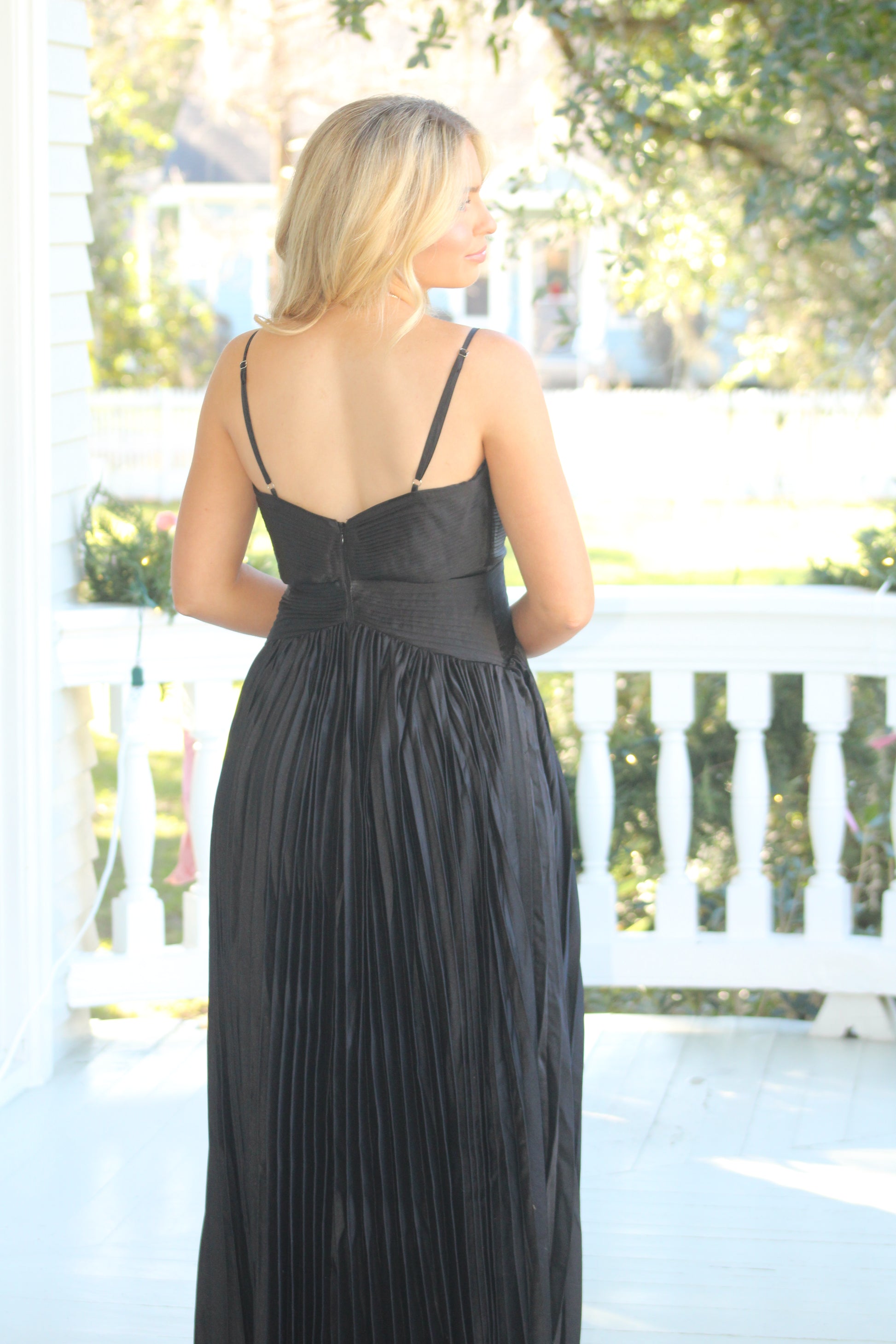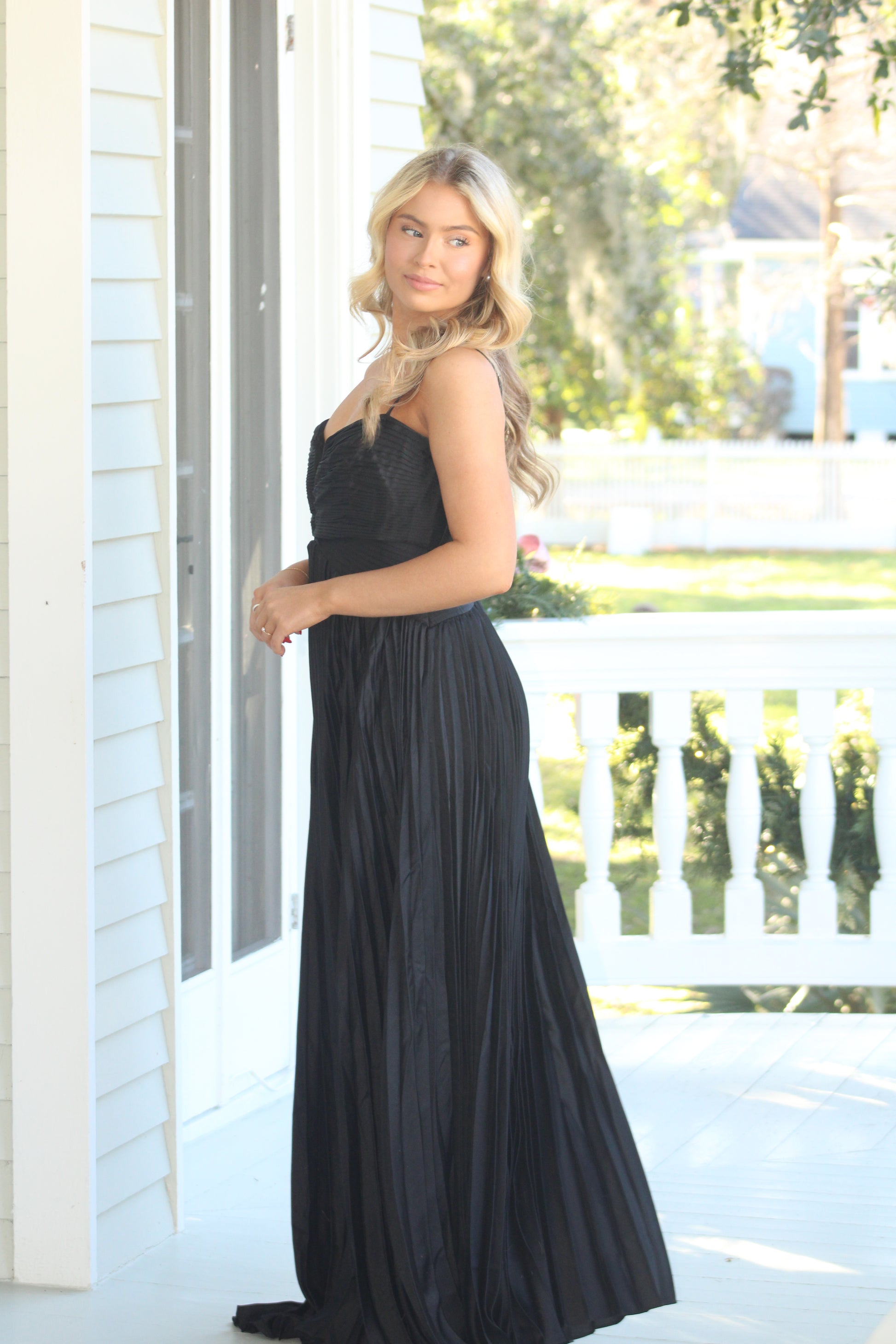 The Ophelia Dress is the perfect choice for a mardi gras ball with its elegant black satin pleated design. This maxi dress will make you stand out and feel confident all night long. Embrace sophistication and style with the Ophelia Dress.